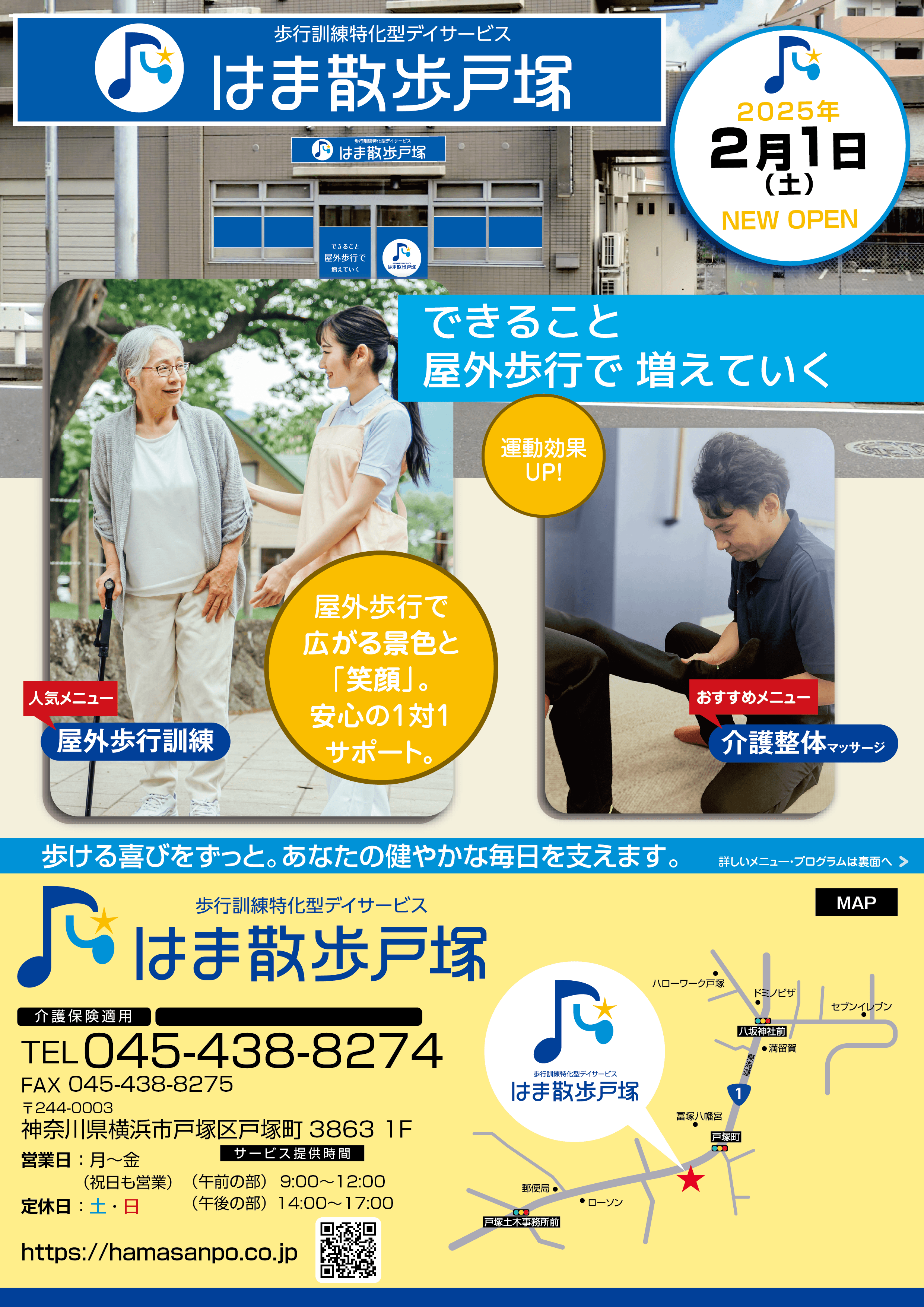 2025年2月1日、横浜市戸塚区に「歩行訓練特化型デイサービス はま散歩戸塚」が新たにオープンいたします!